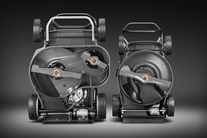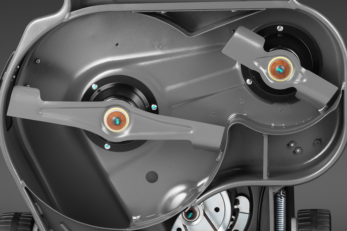 Инновационная система стрижки состоит из двух ножей, вращающихся по перекрывающимся траекториям. Наличие двух ножей значительно повышает производительность, а способ их расположения делает работу более эффективной. Машина обеспечивает высокую скорость работы и отличный результат при любом способе стрижки: боковом выбросе, мульчировании, сборе в травосборник.