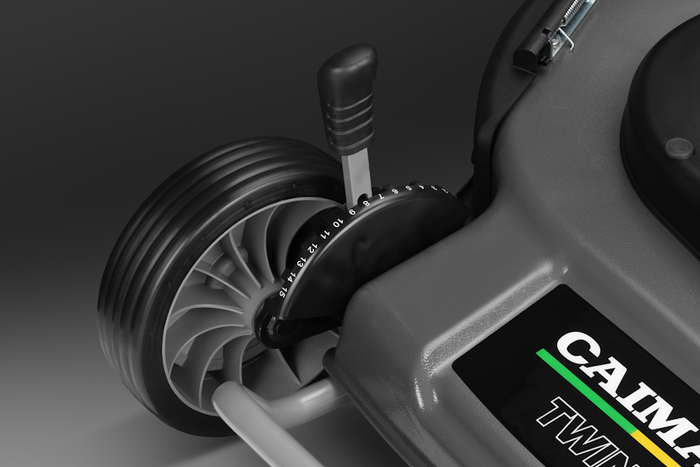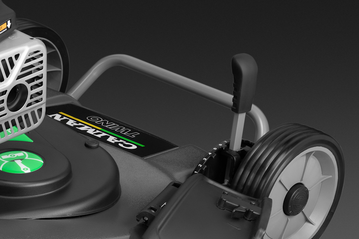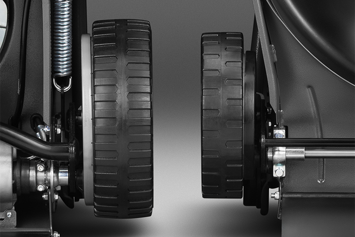 Диаметр и ширина колес на модели Twino увеличены, чтобы давление машины на почву оставалось на уровне моделей с меньшей шириной захвата, и газонокосилка не образовывала колею. Колеса выполнены из нейлона – прочного, легкого, устойчивого к коррозии и воздействию травяных соков материала. Герметичные двойные шарикоподшипники защищены от попадания воды и грязи, они обеспечивают плавный ход даже на сложном рельефе.