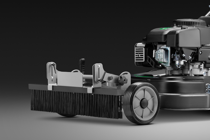 Навесная щетка шириной 77 см позволяет создавать «полосатый» эффект на газоне, приподнимать траву для более аккуратной стрижки, поднимать мусор с поверхности газона для его сбора. Щетка имеет транспортировочное положение, а также регулировку высоты (интенсивности нажатия). Устанавливается вместо переднего бампера.