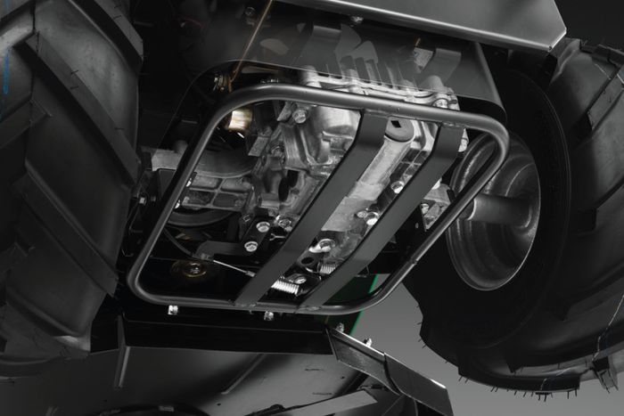 Система механической блокировки дифференциала уменьшает пробуксовку колес и обеспечивает надежную сцепку с поверхностью даже в сложных условиях работы. Это защищает газон от повреждений и увеличивает маневренность машины.