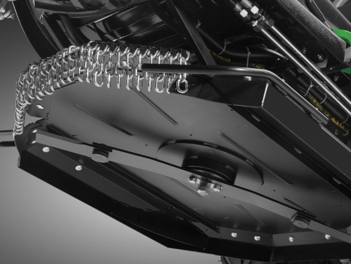 Мощный нож с плавающими элементами справляется не только с высокой травой, но и с кустарником диаметром до 50 мм. Цепные элементы на передней стороне деки не подминают траву, что способствует ее тщательному измельчению. Плавающие элементы ножа надежно предохраняют вал двигателя от повреждения при наезде машины на препятствие. Регулировка высоты стрижки осуществляется в диапазоне от 50 до 100 мм (5 положений рычага), также имеется транспортировочное положение на высоте 120 мм.