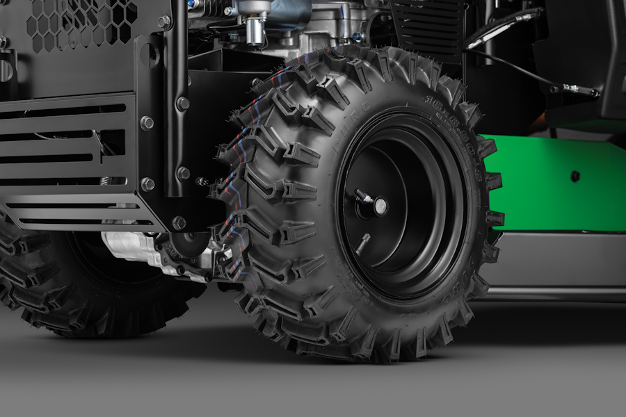 Колеса с шинами, имеющими глубокий рельефный протектор, обеспечивают лучшую проходимость при работе на сложных поверхностях (пересеченная местность) и более высокую эффективность при расчистке от высокой и плотной растительности, по сравнению с газонными колесами.
